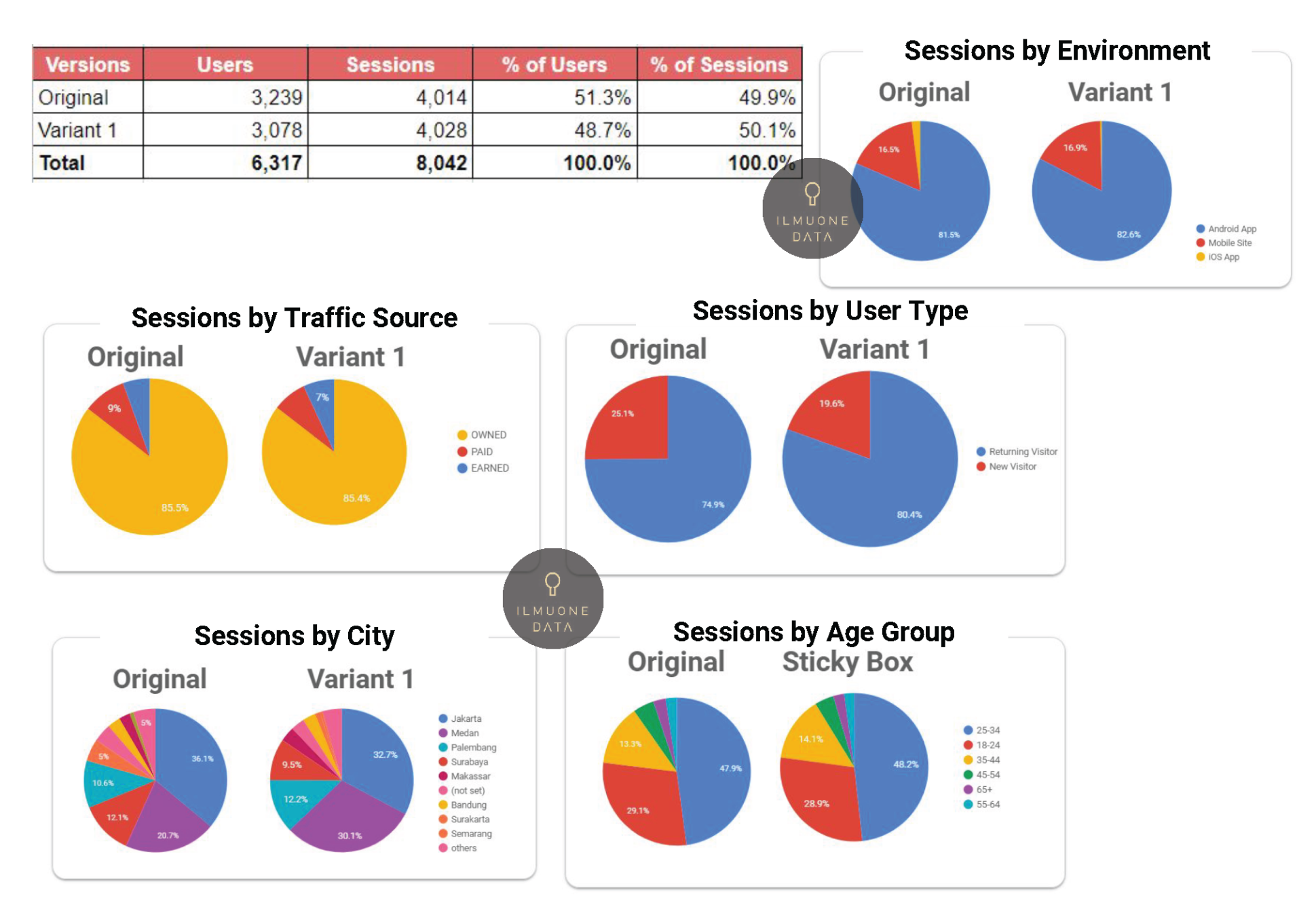 1. Users were distributed evenly across all variants and audience profile (i.e traffic source, city, User Type, Age Group, Environment), which means that the experiment results purely represent the effect of each variants to user engagement.